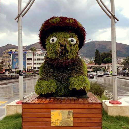 We couldn't help but notice a certain statue featured prominently throughout the city through signs, billboards, and even a larger-than-life topiary positioned at the entrance to the city. It became our quest to locate this strange-looking artifact! Knowing we'd find it in a local museum, we ended up in the wrong spot at the Hatay History Museum, a museum devoted to the Turkish heritage. We were so glad to find our way to the Hatay Archeology Museum (located here), and see this statue of Hittite King Suppiluliuma who ruled in the 9th century B.C.E. The Hittite people believed the king was assigned by God to be protector and "Gate Guard" of society. This statue is one of the oldest artifacts ever discovered in Turkey.